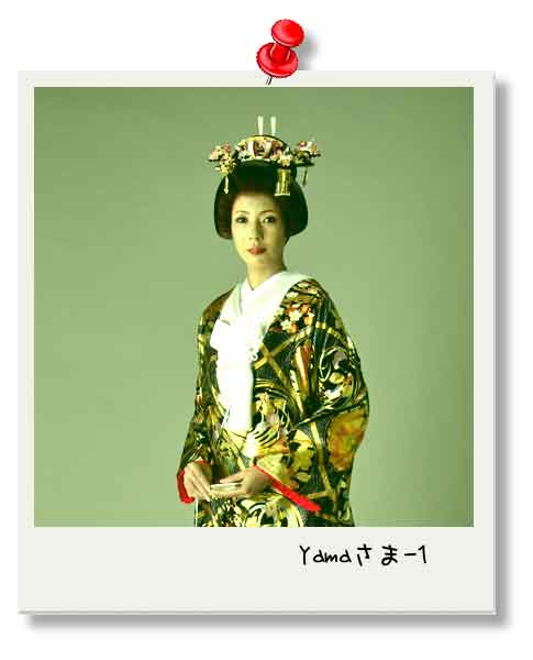 モデルは、チョット大人のYamaさんです。身長が打掛とのバランスが良いので色打掛の艶やかさを全身、基本ポーズで表現しました。美容、着付けは、倉敷市児島で、美容室 H’(アッシュ)を経営する 入江 悦子 さんにお願いしました。倉敷地区の4社からブライダルサロンに指定されています。技術力の高さの証です。性格明るく良くしゃべる。