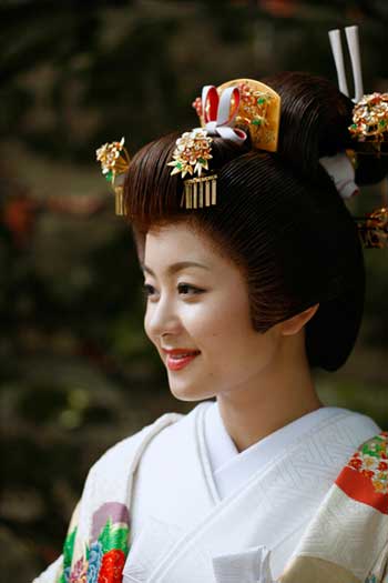 昨今、文金高島田の花嫁かつら離れが進んでいるようです。理由はいろいろあるのでしょうが、文金高島田姿の品格に敵うものはありません。しかしながら、美しい文金高島田着装の花嫁になるには、作り手の確かな技術と、知識、感性が必要とされます。皆様方は、より確かな美容師を選択することが、美しい花嫁になる第一歩です。当工房のかつらで挙式された方々から度々感謝のお言葉をいただいています。