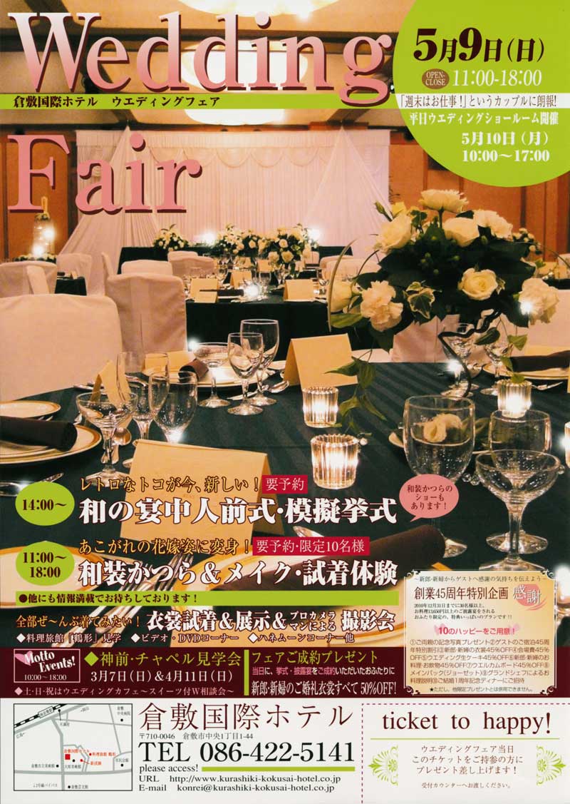 2011年2月6日(日)の倉敷国際ホテルのウエディングフェアに参加ご希望の方は倉敷国際ホテル婚礼予約課の原田さん、中藤さんにお申し込みください。tell 086-422-5144
