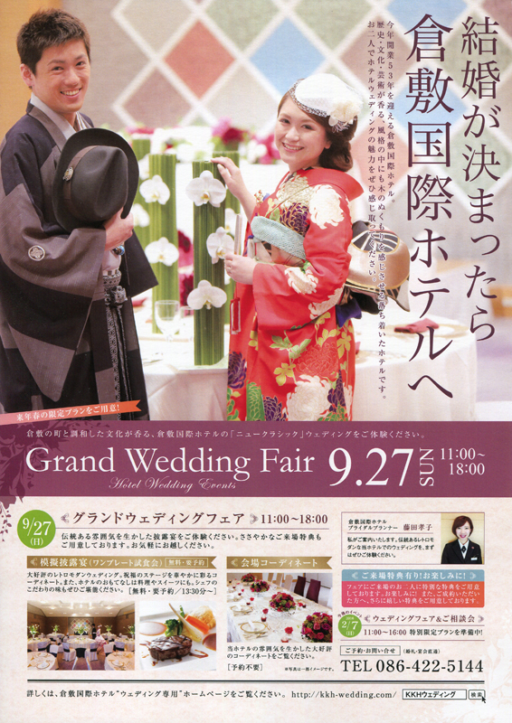 次回倉敷国際ホテルのウエディングフェアーは11月20日(日)に開催されます。参加ご希望の方は倉敷国際ホテル婚礼予約課の原田さん、中藤さん、藤田さんにお申し込みください。トラディショナルな和装をお望みの、倉敷で挙式をお考えの方はぜひご来場ください。
